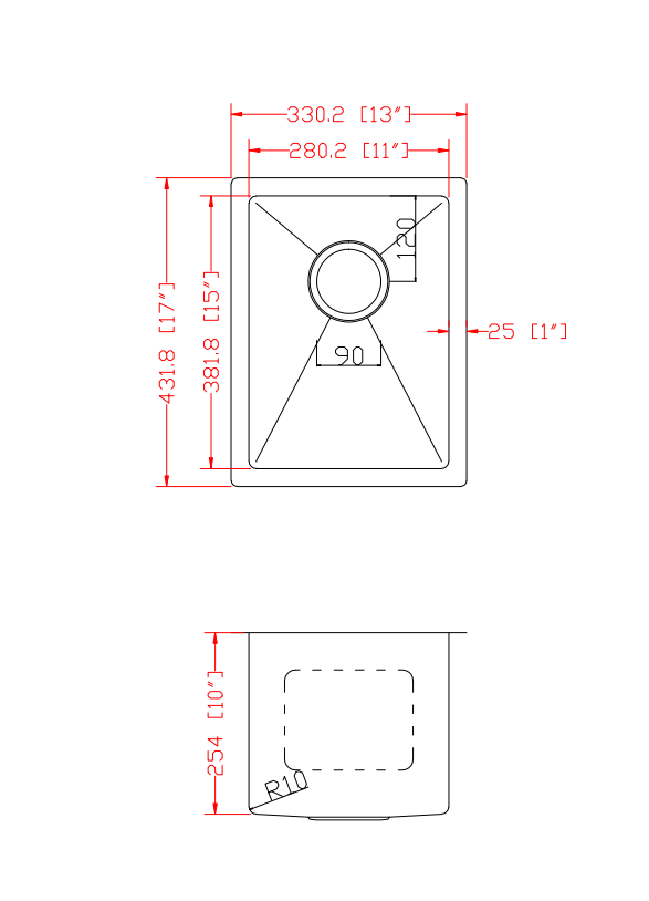 The tight R10 radius corners provide a contemporary square look while remaining easy to clean. A satin finish minimizes scratches and water spots, keeping the sink looking refined over time.