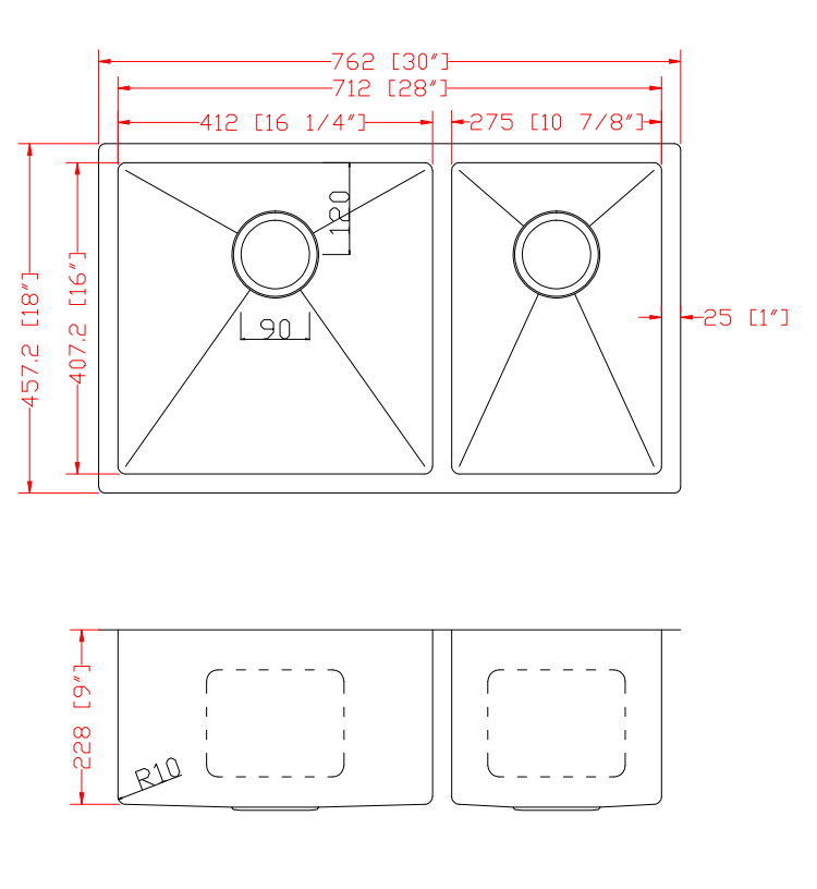 Its offset double bowl configuration—with a larger bowl on the left—makes it easy to handle large cookware while still maintaining a separate space for rinsing, prep, or cleaning. The R10 radius corners provide a modern, streamlined appearance while remaining easy to maintain.