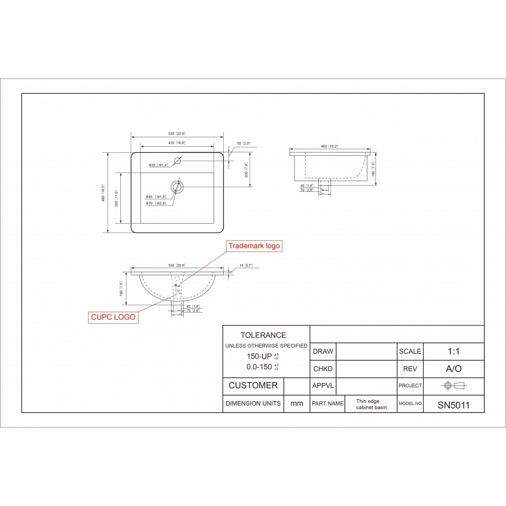 With dimensions of 530 × 460 × 190 mm (20 7/8" × 18 1/4" × 7 1/2"), the Halo sink offers a perfect balance between style and functionality, making it ideal for modern bathroom installations.