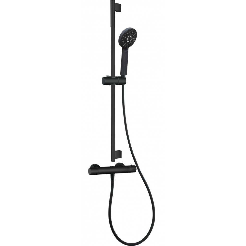 Upgrade your shower to a modern look with a sliding bar shower height adjuster, 2 function hand shower, in ABS black. The assembly also comes with an ABS soap plate, a 1.5 mm PVC flexible hose that is cUPC certified and a L21T thermostatic black shower mixer for ease of use. No faucet included.