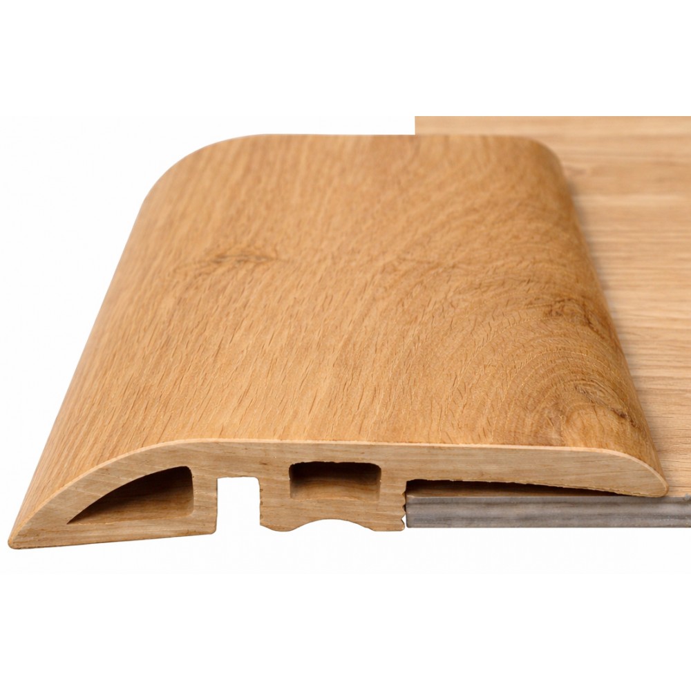 Engineered SPC reducer. Provides a smooth transition between floors of different heights while protecting edges and enhancing the finished look.