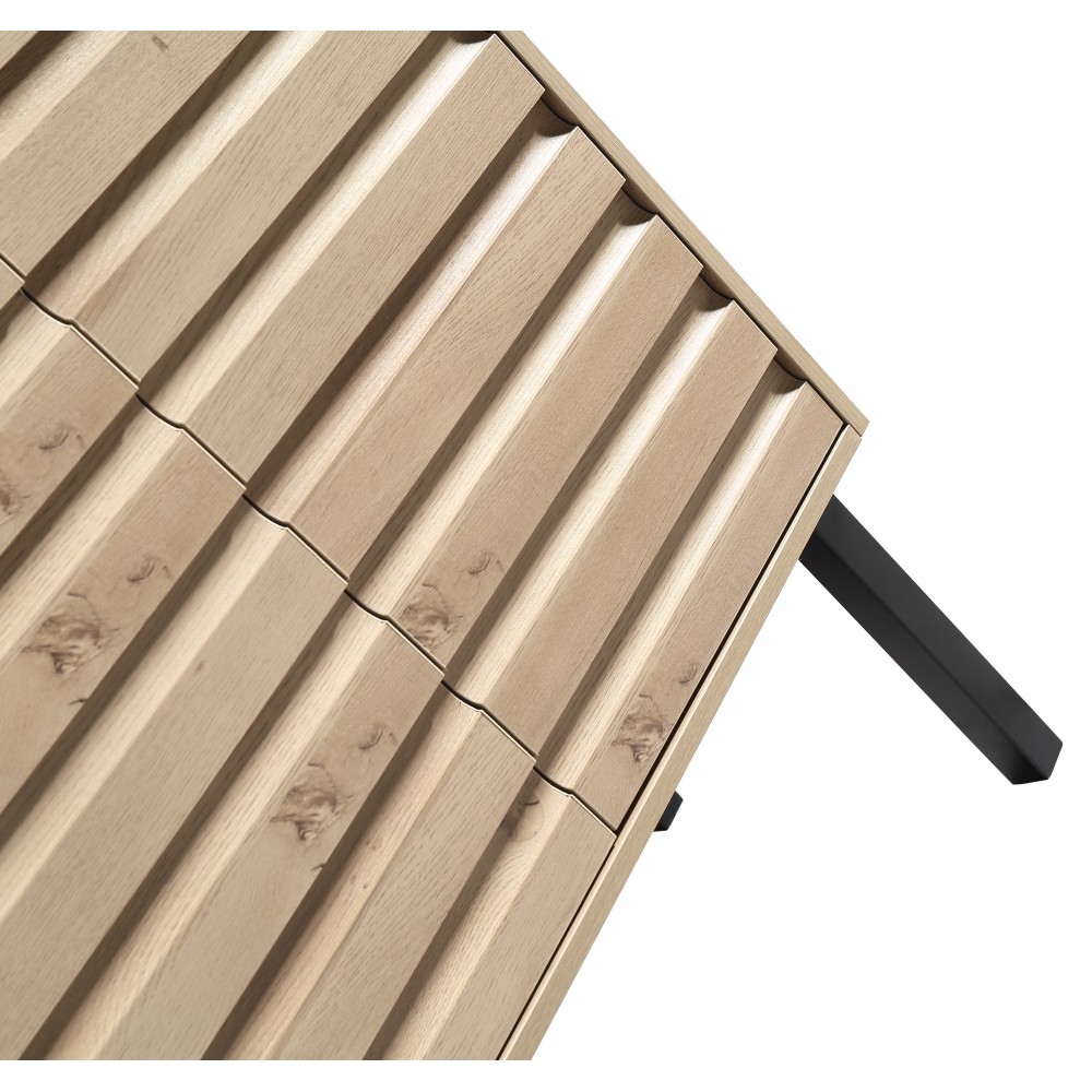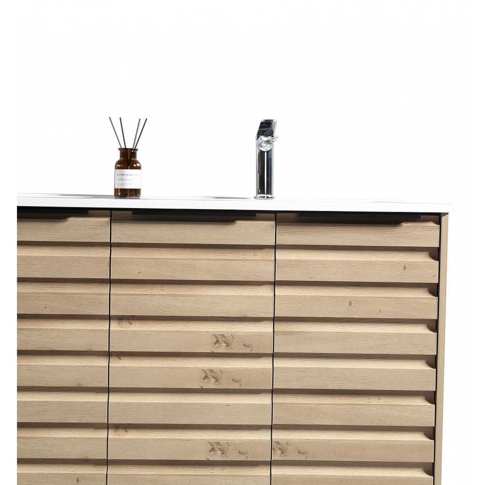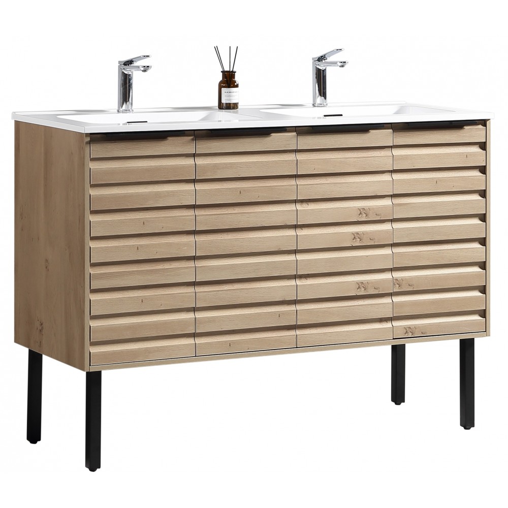 La vanité Tavira 48" incarne l’élégance moderne avec sa façade à rainures horizontales et sa finition chaleureuse Zurich Oak. Montée sur une base en métal noir au style minimaliste, elle combine texture naturelle et géométrie raffinée pour créer un meuble à la fois contemporain et intemporel.