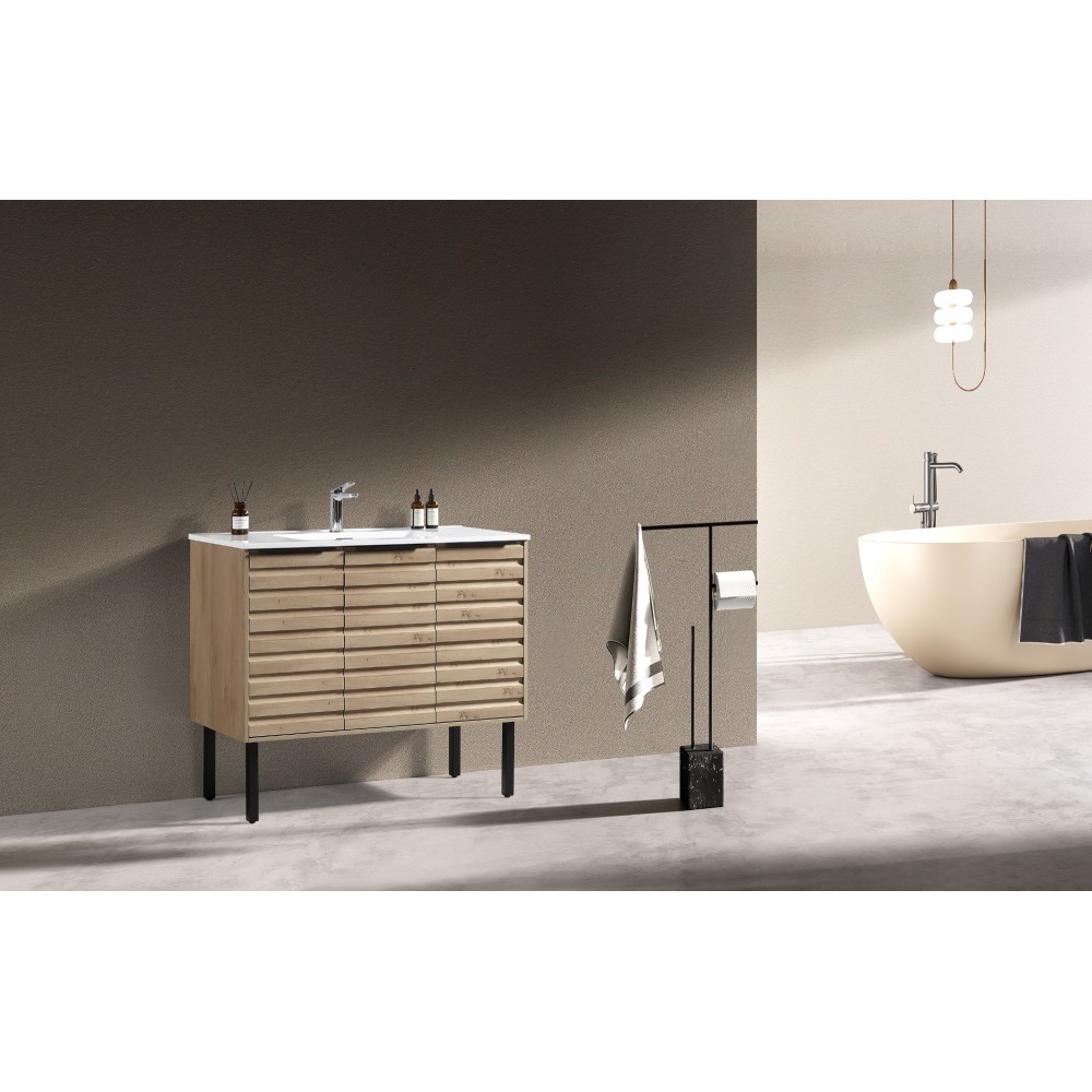 La vanité Tavira 39.5" incarne l’élégance moderne avec sa façade à rainures horizontales et sa finition chaleureuse Zurich Oak. Montée sur une base en métal noir au style minimaliste, elle combine texture naturelle et géométrie raffinée pour créer un meuble à la fois contemporain et intemporel.